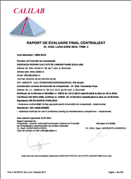 Pentru a crește calitatea serviciilor oferite, laboratorul derulează, încă de la inceputul activității sale, controale interne de calitate cu materiale de referință, iar acuratețea rezultatelor este confirmată prin participări la controale externe de calitate.